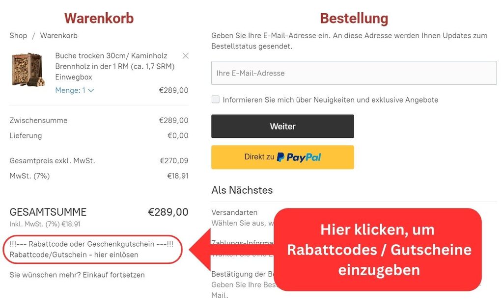 1. Direkt auf der ersten Seite, sobald du den Warenkorb öffnest, findest du unter der Gesamtsumme den Gutscheinbereich (siehe Bild). Klicke auf den Text.